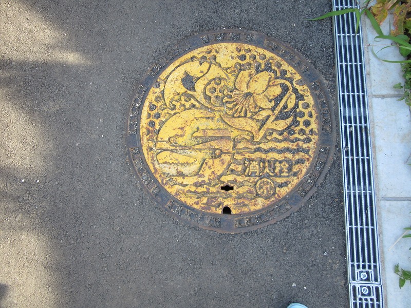 家の近くにて見つけました!【神奈川県営水道】中央に県の花:ヤマユリが目立ちますが,県の木:イチョウの葉もあり,県の鳥:カモメもいます。消火栓なので黄色く塗られています